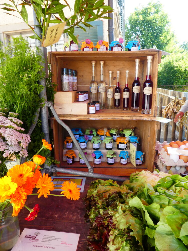 Gemüse: Auf der hofeigenen Fläche werden über 100 verschiedene Gemüsekulturen angepflanzt. Wir haben eine saisonale Auswahl an Wurzelgemüse, Blattgemüse, Fruchtgemüse, Kohlgemüse, Hülsenfrüchte und Kräuter. Der Gemüseanbau ist das Herzstück des Kulturhof Winterthur und kann nur durch tatkräftige Helferinnen und Helfer aufrechterhalten werden. Pilze: Um auch die Schattenflächen optimal nutzen zu können, kultivieren wir auch Pilze. Im Moment sind Austernseitlinge und Winterseitlinge vordergründig. Obst: Ob auf Eigenland oder Pachtland, insgesamt haben wir schon über 160 Hochstamm- Obstbäume gepflanzt. Most und Apfelessig sind im Moment das Hauptangebot. Blumen: Neben den blühenden Tulpen und Narzissen im Frühling, pflanzen wir auch gezielt Nützlingsanreizer wie Ringelblumen und Sonnenblumen oder essbare Blumen wie der Kapuzinerkresse. Kräuter: Die aromatischen Kräuter entfalten ihre Aromen in unseren selbstgemachten Produkten.